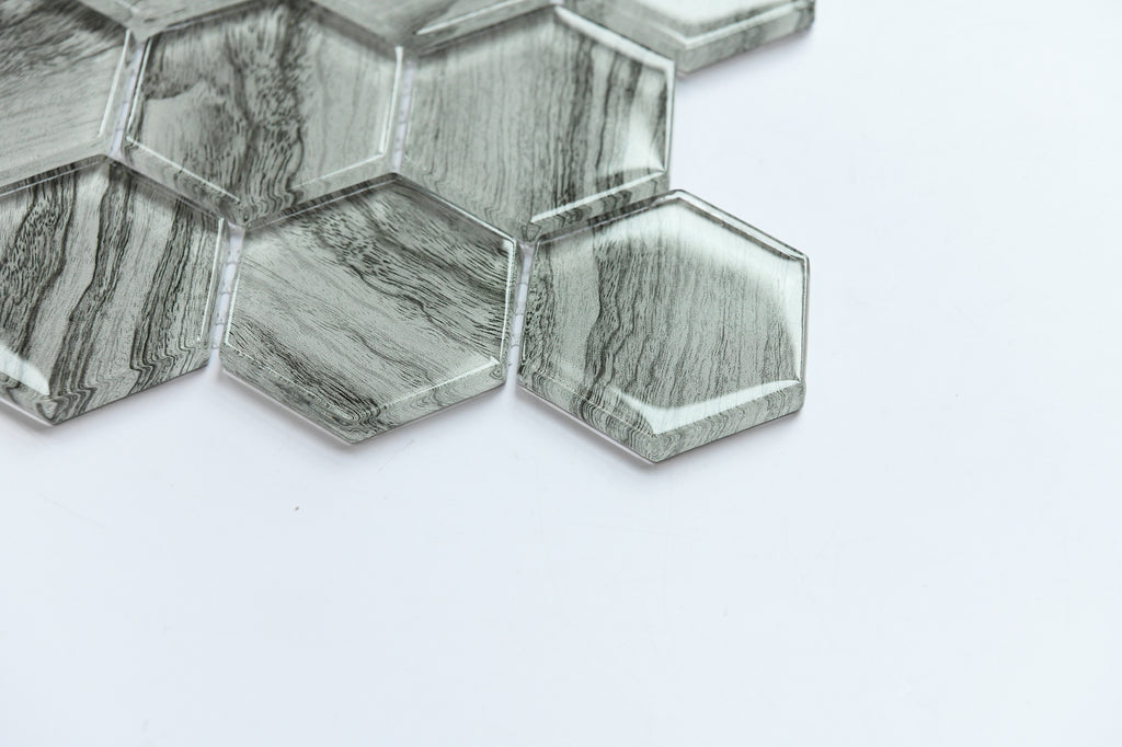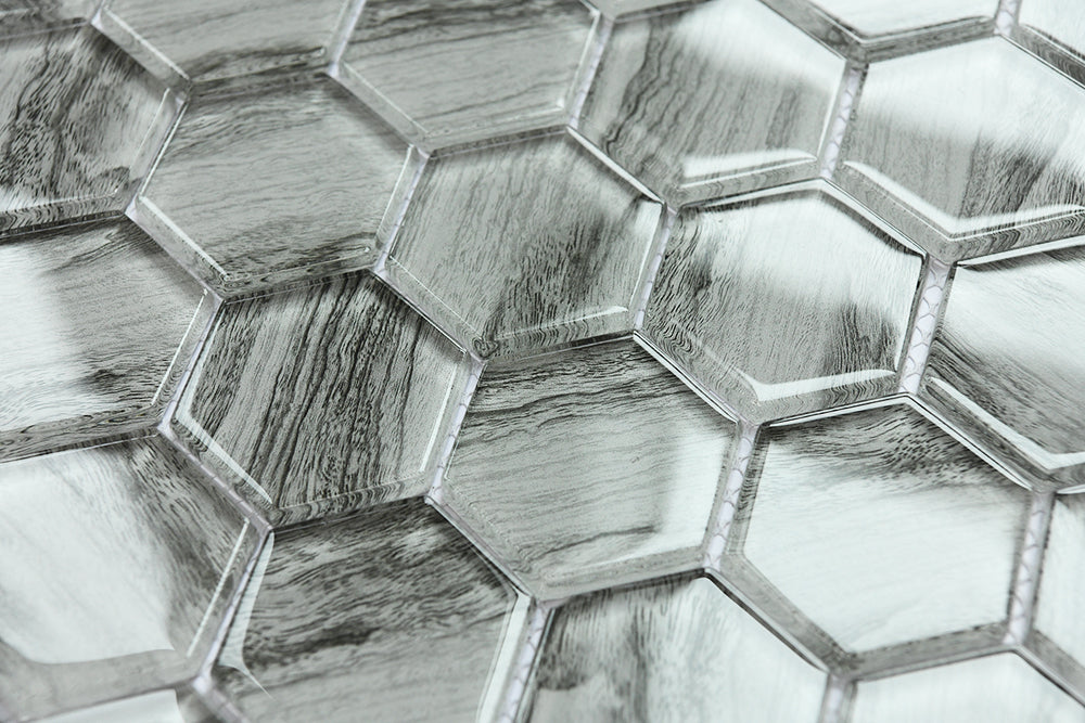 Grey Wood Look Glass 2” Hexagon Glass Mosaic Tile